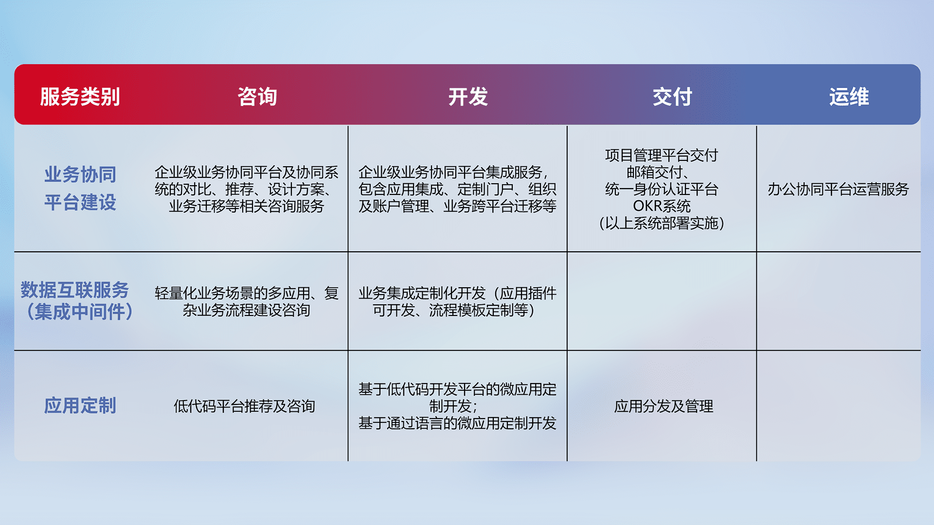 针对钉钉、、、企微、、、IDaas等平台级产品提供产品的规划、、方案、、、、交付、、、、定制化开发等服务,,,,实现如统一协同办公、、、智能客户服务、、混合会议管理、、智能数据查询、、、等业务场景,,,实现数字化转型。。